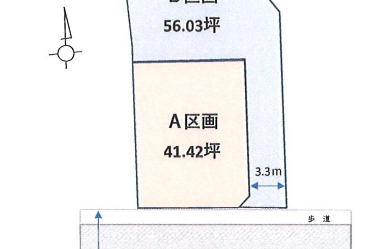 | 土地面積・権利・地目・都市計画 | A区画 136.93㎡(約41.42坪) B区画 185.24㎡(約56.03坪) 所有権・宅地・市街化区域 |